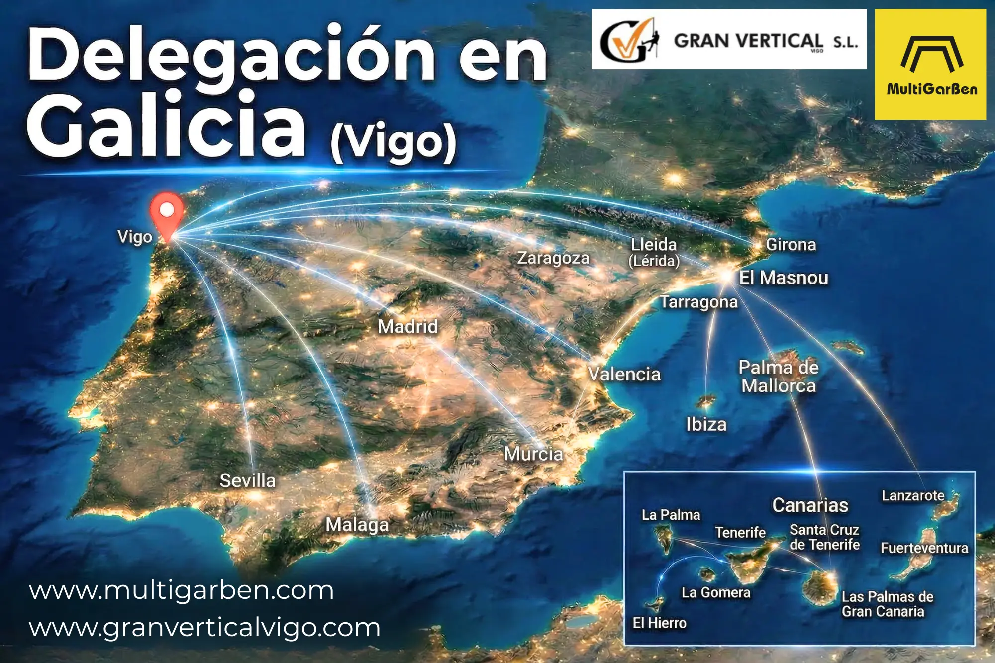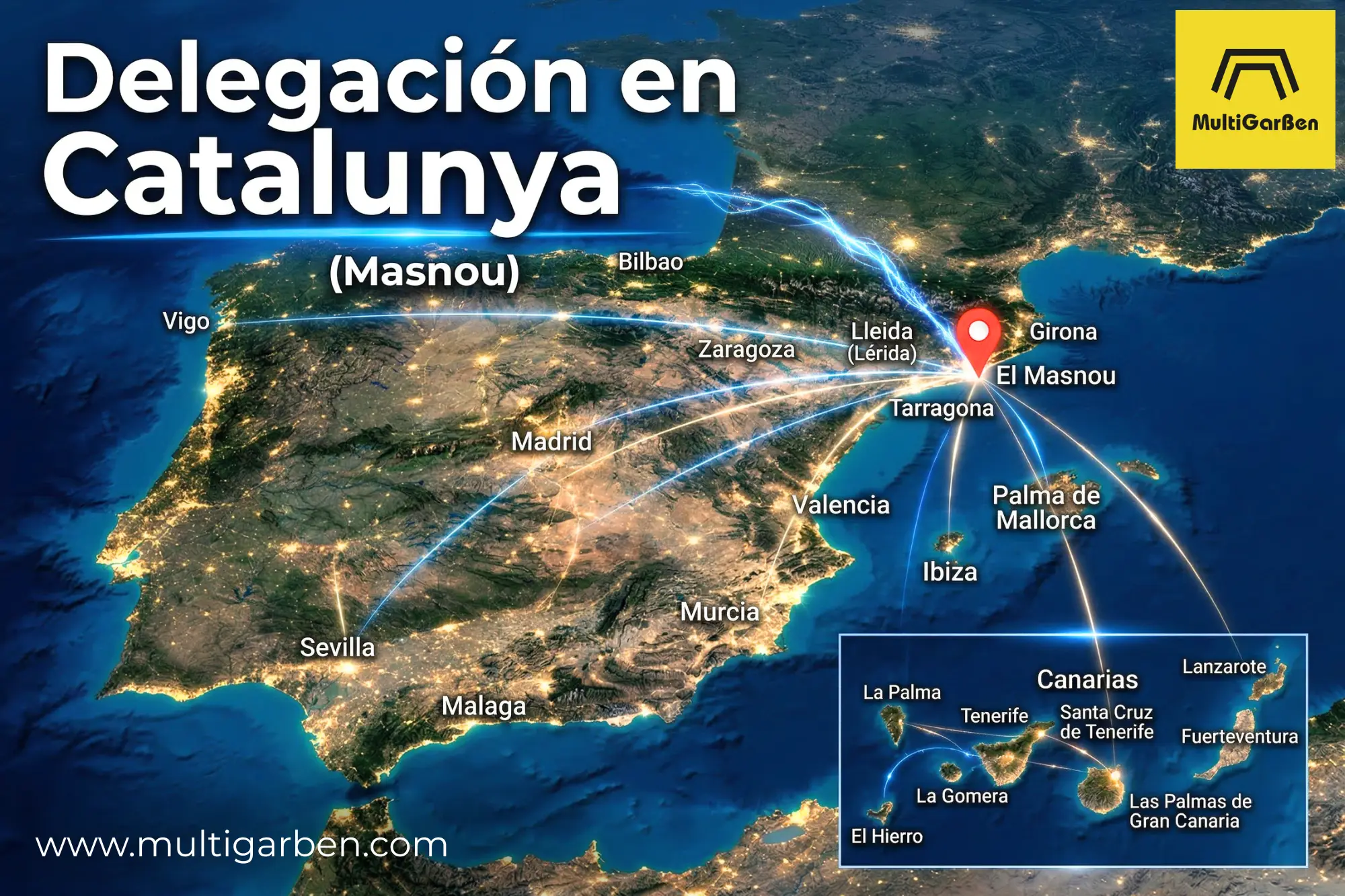 Nuestra cobertura territorial se apoya en delegaciones estratégicas como El Masnou (Barcelona), a las que se han sumado más recientemente Vigo (Galicia) y Santa Cruz de Tenerife (Islas Canarias), ampliando así nuestra capacidad de respuesta y mejorando la proximidad en diferentes puntos clave del territorio.